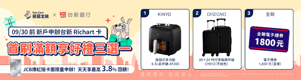 活動內容: 新戶於活動期間內透過撲滿日記專屬連結申辦台新銀行Richart卡,且核卡30天內使用該卡累積消費滿NT$3,000,即享好禮三選一。