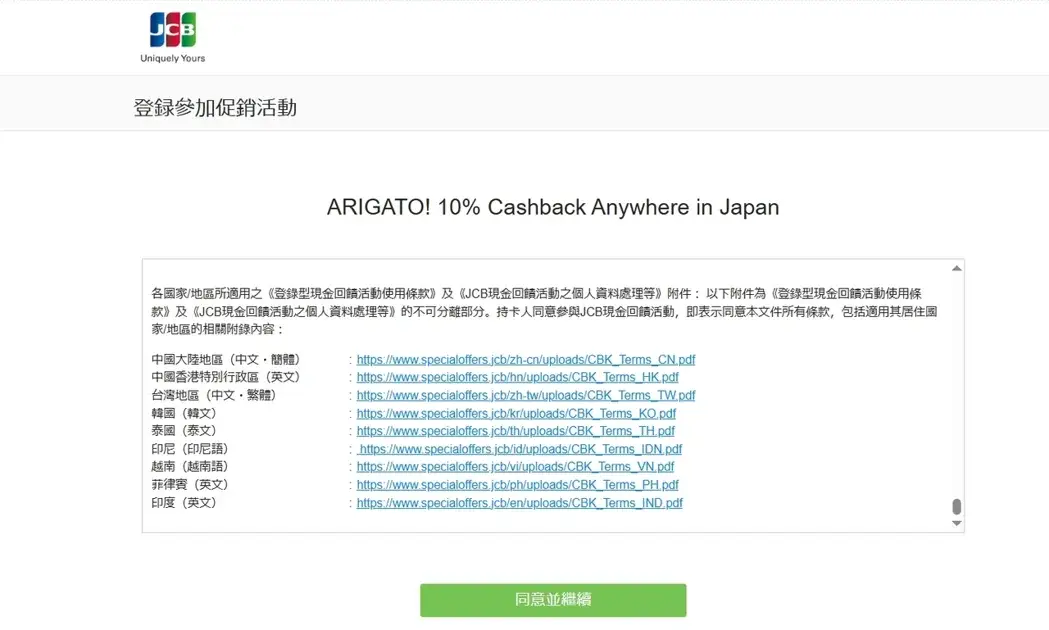 點選 JCB 官方活動頁面,找到「馬上註冊 (Register Now)」按鈕。閱讀完活動條款後,勾選「同意並繼續」。