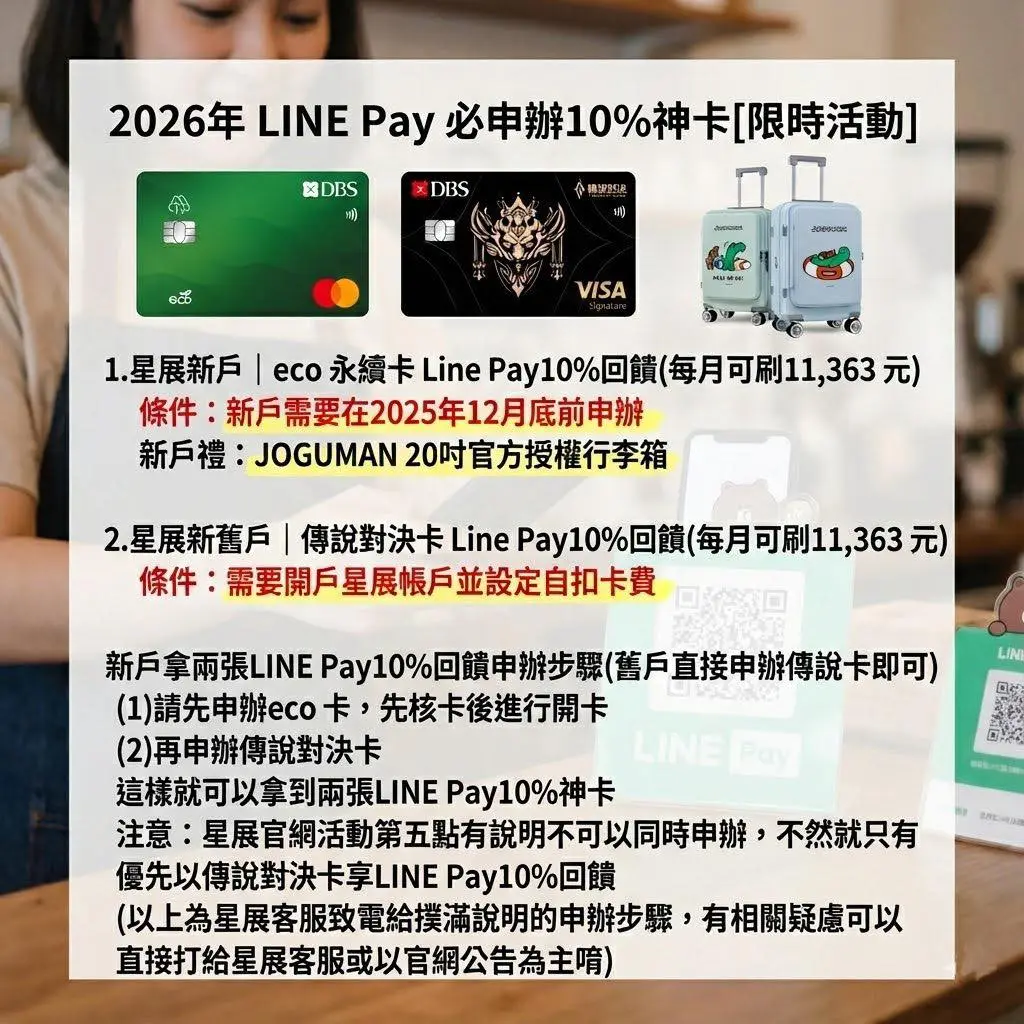 💡 星展強刷攻略: 必須先辦 eco 永續卡 拿新戶資格,核卡 30 天內刷滿 $1,000;隨後再加辦 傳說對決卡。如此一來,每月 LINE Pay 回饋額度可撐到 2,000 點,是消費大戶的首選。