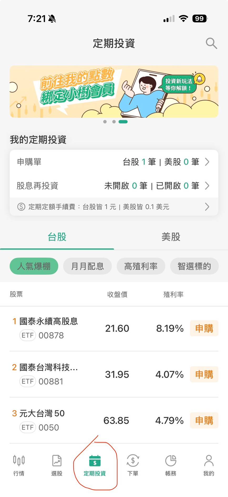 挑選標的: 選擇你想投資的台股或美股標的,點擊申購。
