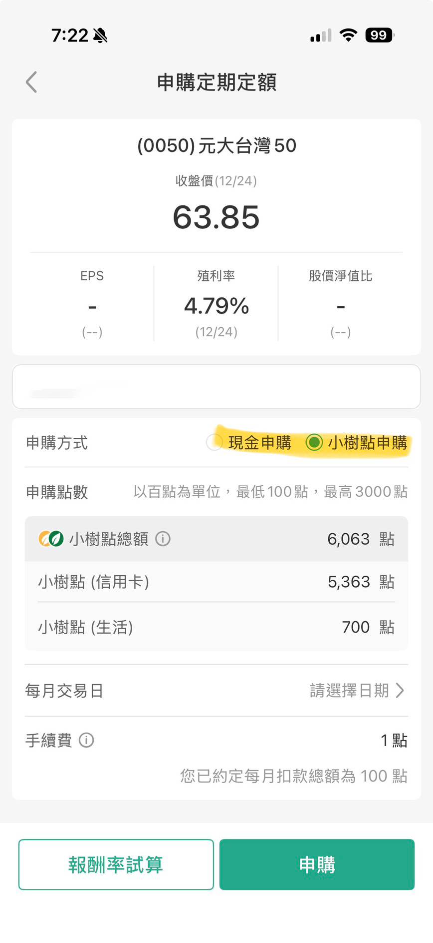 選取申購方式: 付款方式改選**「小樹點申購」**。